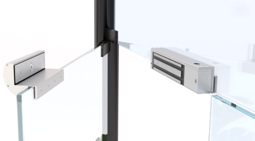 Asennuskulma sarja oviympäristöön, jossa sekä ovi että karmi ovat lasia.