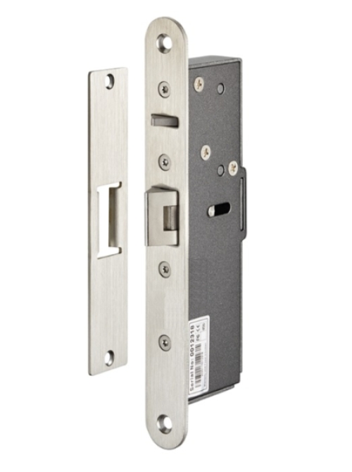 Ruostumattomasta teräksestä valmistettu uppoasennettava sähkömekaaninen lukko erilaisiin ovityyppeihin.